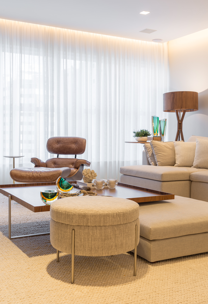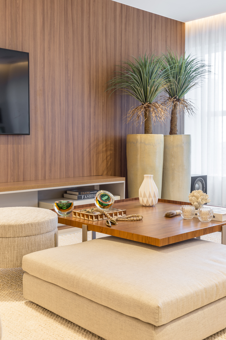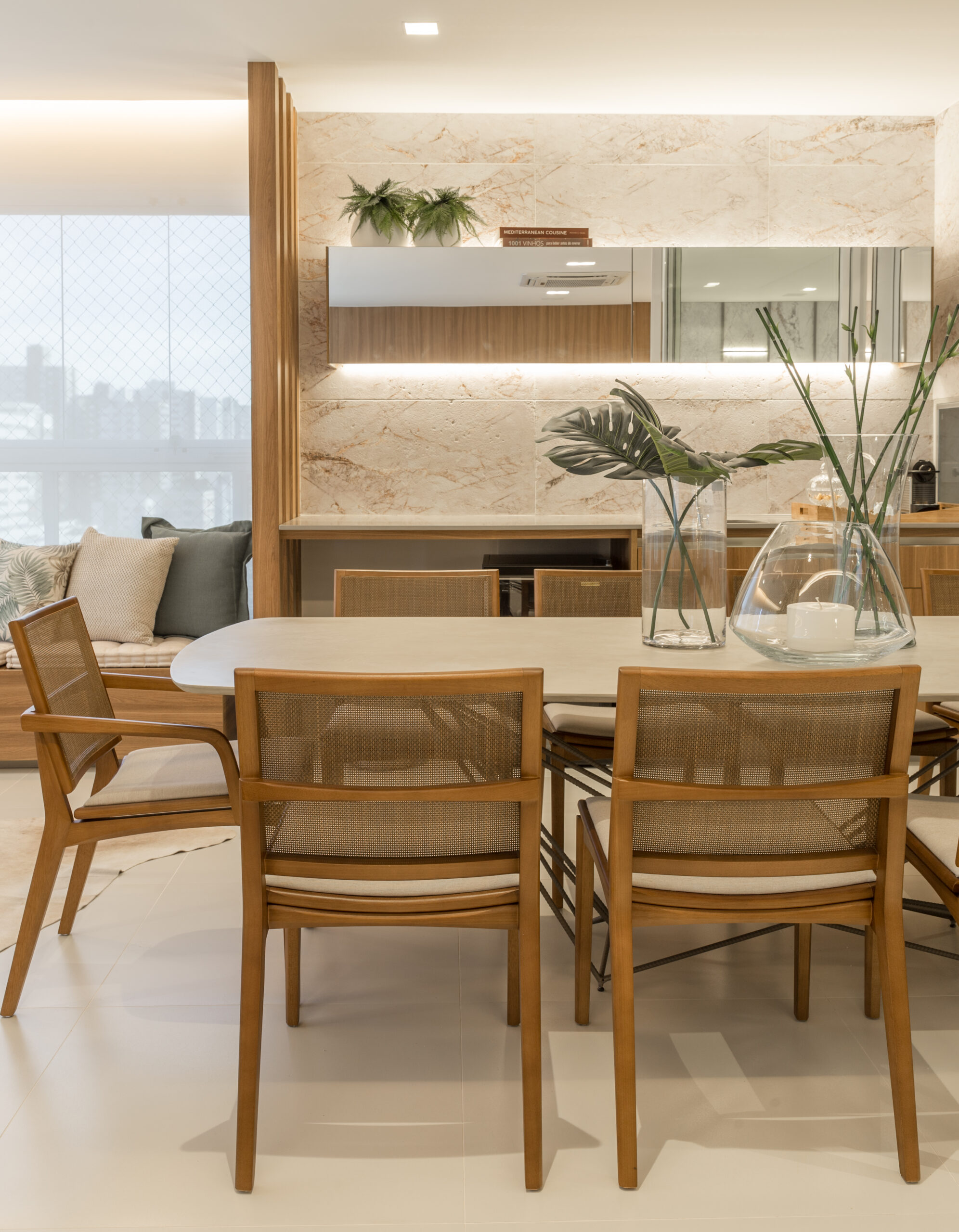 A sala de estar é espaçosa e convidativa, onde tons suaves de bege, off-white e madeira se entrelaçam harmoniosamente. Um impressionante painel de Castelatto Calacatta Gold, habilmente iluminado e assentado de forma diferenciada, adiciona um toque de luxo e sofisticação ao ambiente.