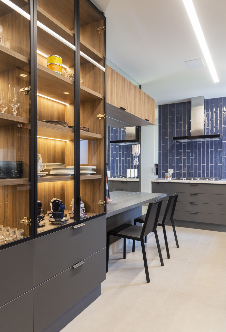 Localizado em um cenário privilegiado, de frente para o deslumbrante cartão postal da nossa cidade, o Parque do Ingá, este lar oferece uma vista espetacular que se torna o pano de fundo perfeito para um ambiente requintado. Com uma paleta de cores que evoca uma sensação de serenidade e masculinidade, optamos por tons de azul marinho, couro caramelo, madeira nogueira e mármore bronze armani. Essa combinação de materiais e cores cria uma atmosfera acolhedora e luxuosa, convidando a relaxar e desfrutar dos momentos de contemplação. O estar integrado foi cuidadosamente projetado para oferecer uma experiência versátil, onde diferentes cenários podem ser criados para atender às diversas atividades da família. Seja para reunir-se para uma noite tranquila, apreciar um bom vinho com amigos ou simplesmente contemplar a vista deslumbrante, este espaço é o local perfeito para criar memórias duradouras. Cada detalhe foi pensado para oferecer conforto e funcionalidade, sem comprometer o estilo e a elegância. É um convite para viver a vida com sofisticação e apreciar os pequenos luxos que tornam cada dia especial.